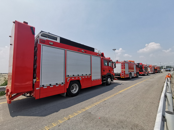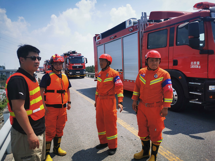 高遠(yuǎn)圣工應(yīng)急救援消防車,配合江蘇消防支隊(duì)的遠(yuǎn)程供水車在荷寶高速鳳泉口、新中大道前辛莊路口進(jìn)行清障、警戒、抽水任務(wù)。